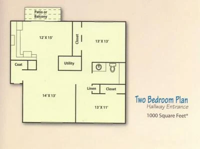 This is our two bedroom, one bathroom floorplan with 1,000 square feet of living space. Please call a member of our friendly leasing staff for more information!